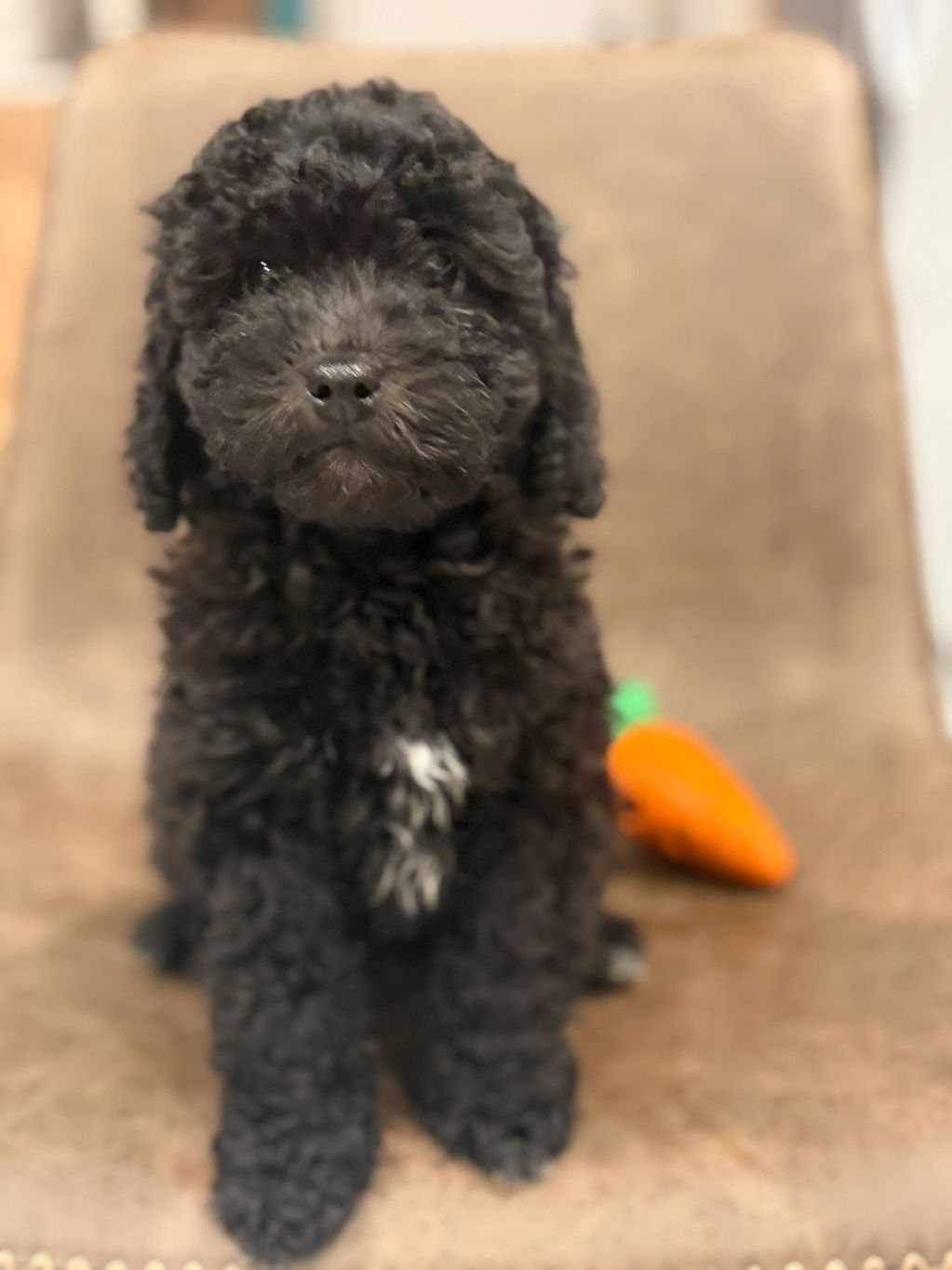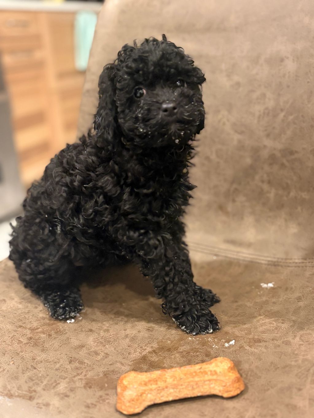 Tiny black curly F1bb female Cockapoo puppy. Playful yet calmer than her sister. Petite size (approx 10 lb adult)